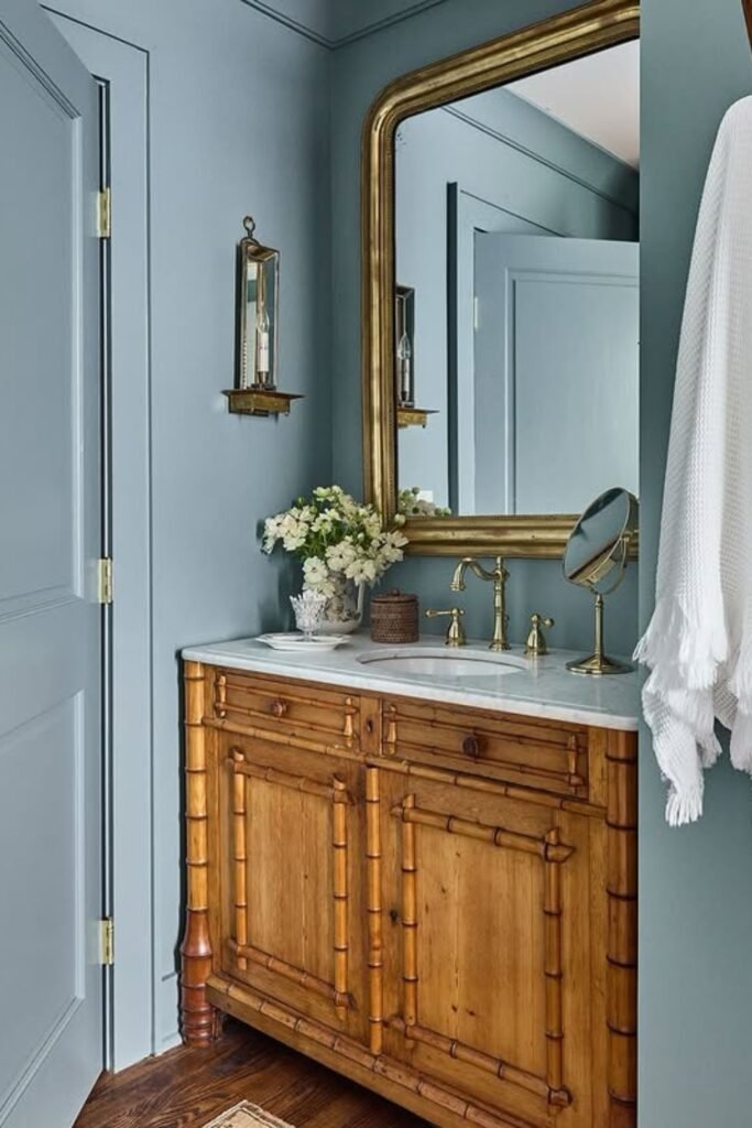 You can turn any powder room into a statement space with one bold choice, a gold-framed mirror that bounces light beautifully off soft blue walls.