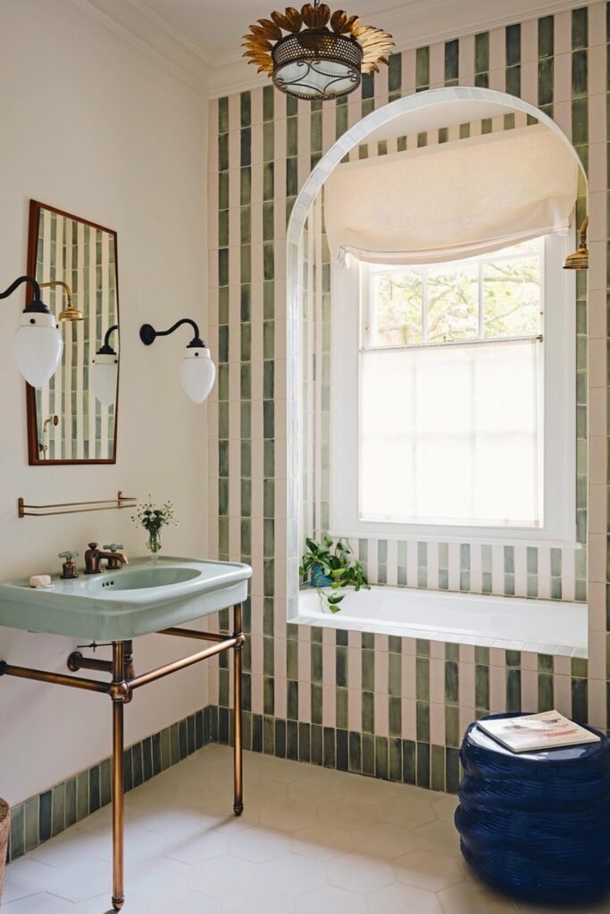You can make any narrow bathroom feel taller with this design, soft green vertical tiles naturally draw your eye upward.
