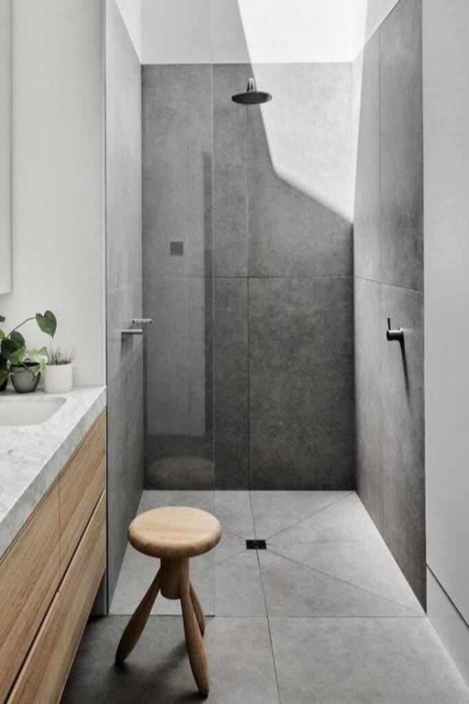 The large grey tiles flow from wall to floor like a single canvas, and the natural light bouncing off them gives the space a serene openness.