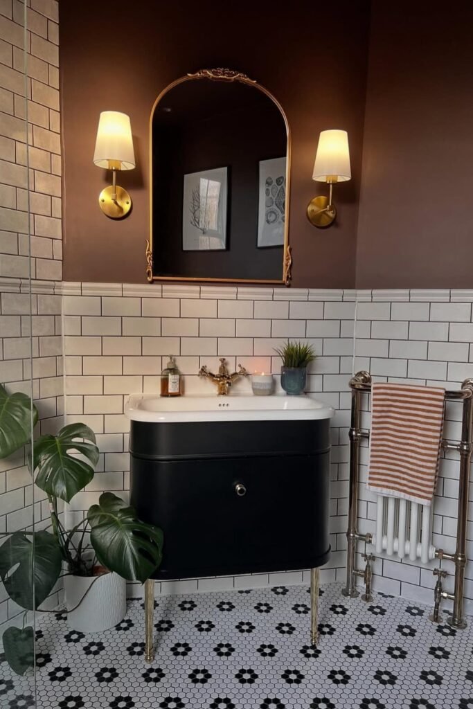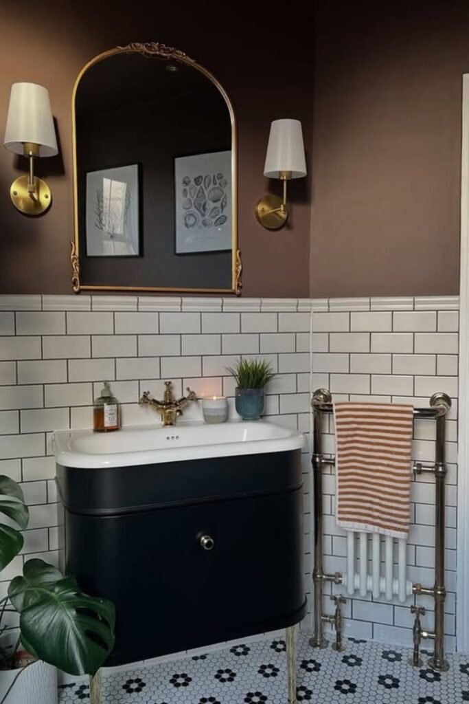 The glossy white tiles paired with dark grout give structure, while a rich brown wall above adds instant drama.