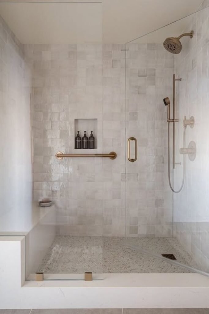 You’ll want porcelain wood tiles wrapping the walls, a stone pebble floor underfoot, and brushed brass fixtures to add that soft golden glow that makes everything feel indulgent.