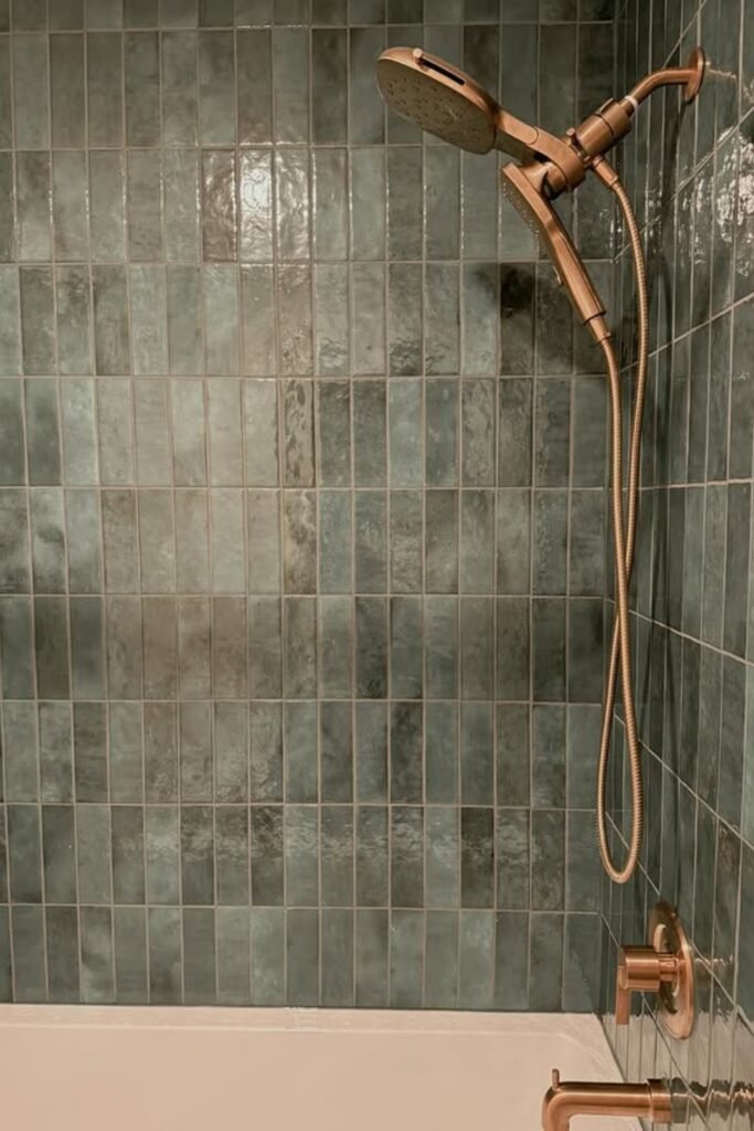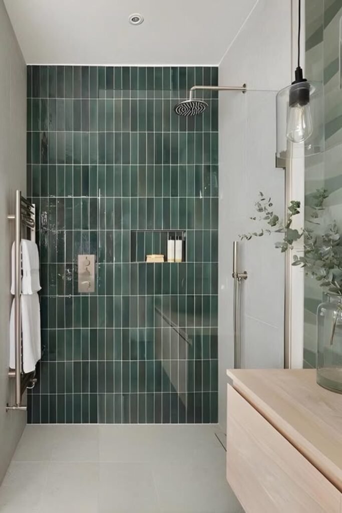 You want color that feels bold but refined? Deep emerald tiles do just that. Their glossy finish catches the light and makes narrow showers feel taller.