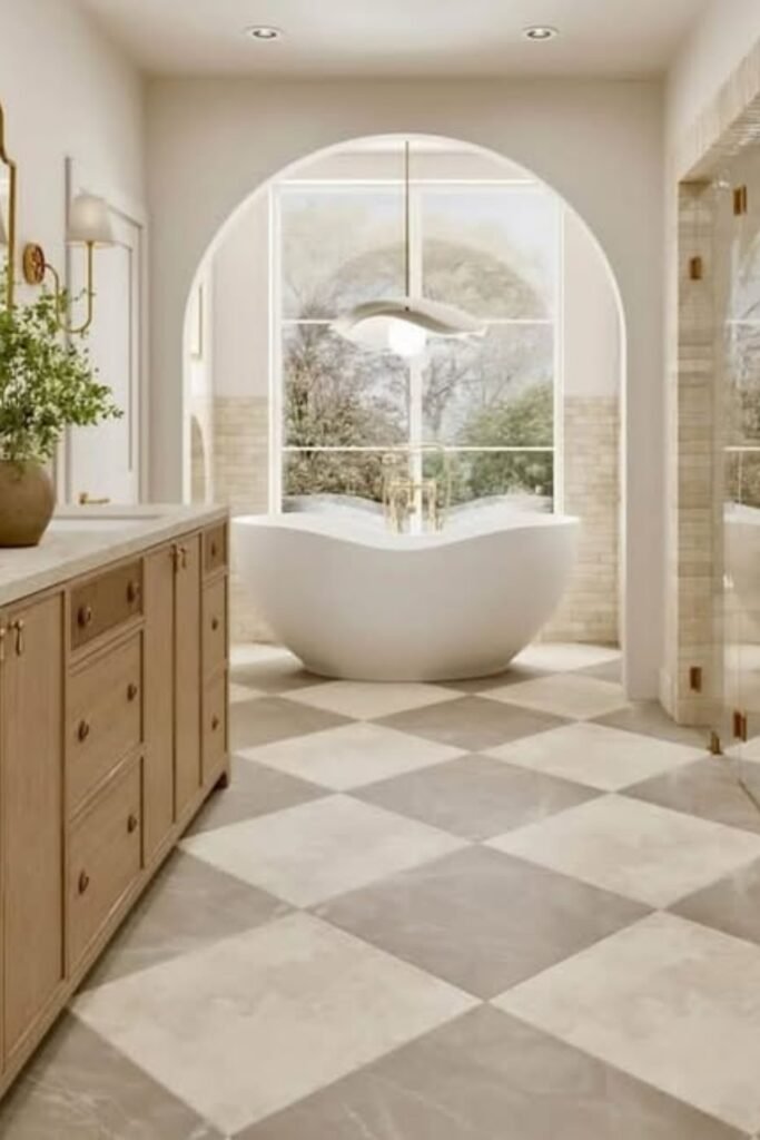 The beige and ivory tiles bring calm, while the arched window over the tub adds pure luxury.