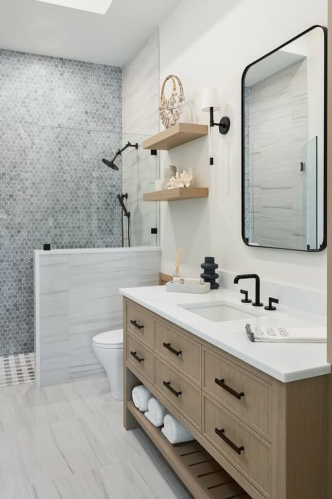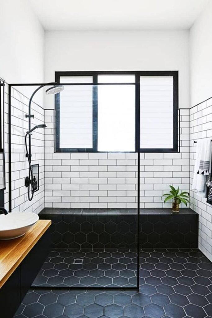 If you love crisp contrast, this design is all you. The white subway tiles look clean and structured, while the matte black hex floors ground everything with bold texture.