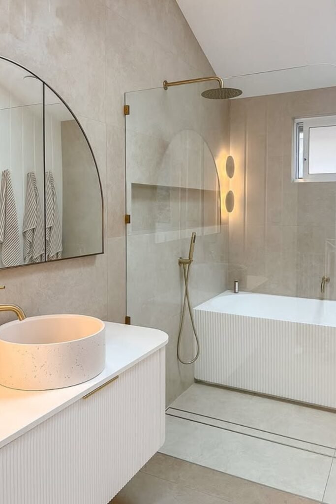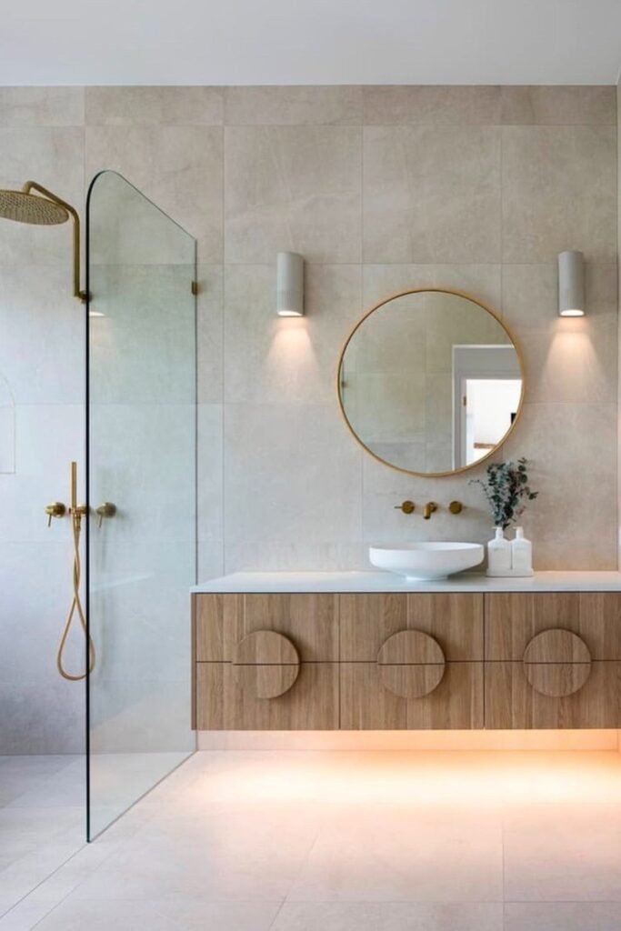 When you want calm without plainness, this is your blueprint. Beige tiles, curved mirrors, and brushed gold fixtures create a layered, inviting minimalism.