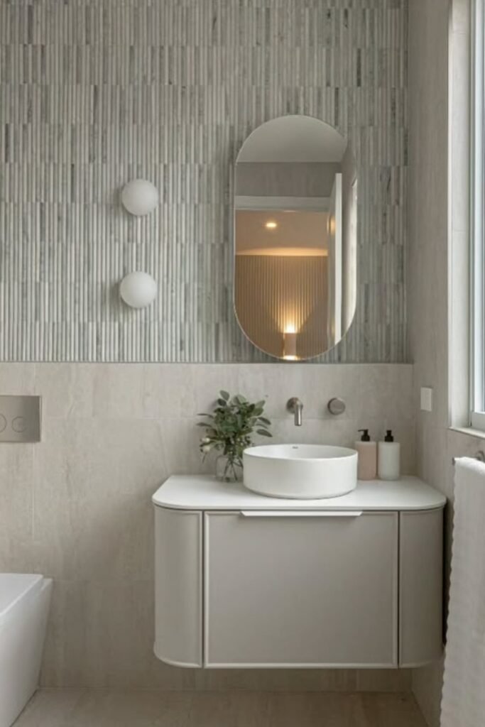 They add texture and depth without overpowering the room. You get that serene, spa-like feeling while keeping things modern with a floating vanity and rounded mirror.