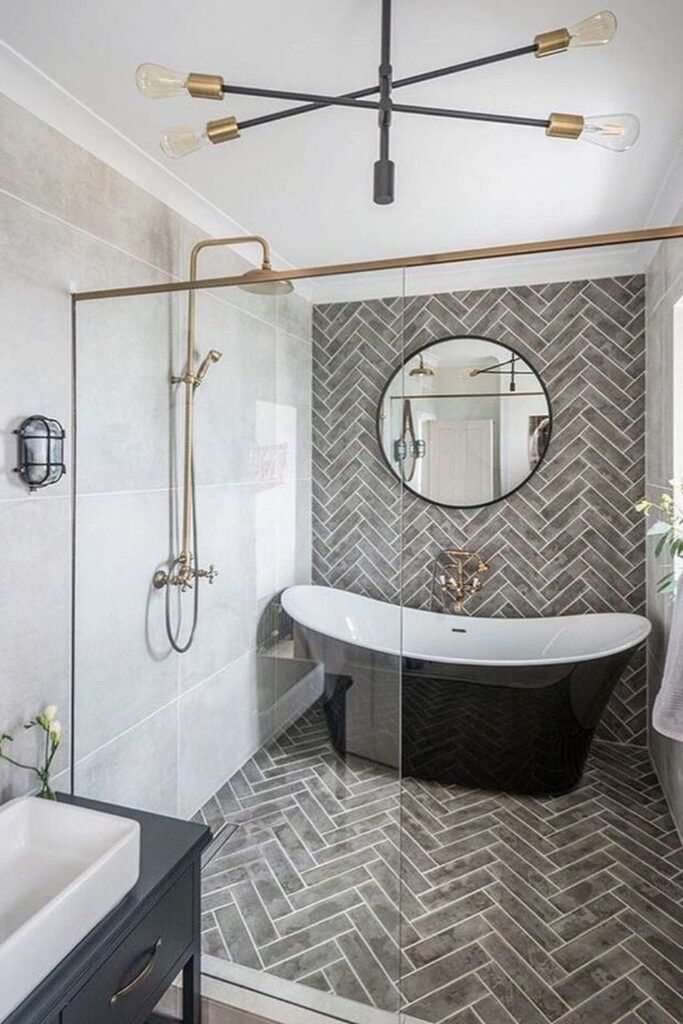 You can instantly make your bathroom feel dramatic with a charcoal herringbone floor that leads the eye straight to your freestanding black tub.