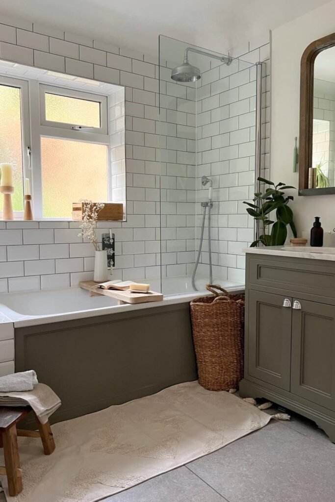 You can make your bathroom feel calm and inviting with classic white subway tiles and a soft sage-green vanity.