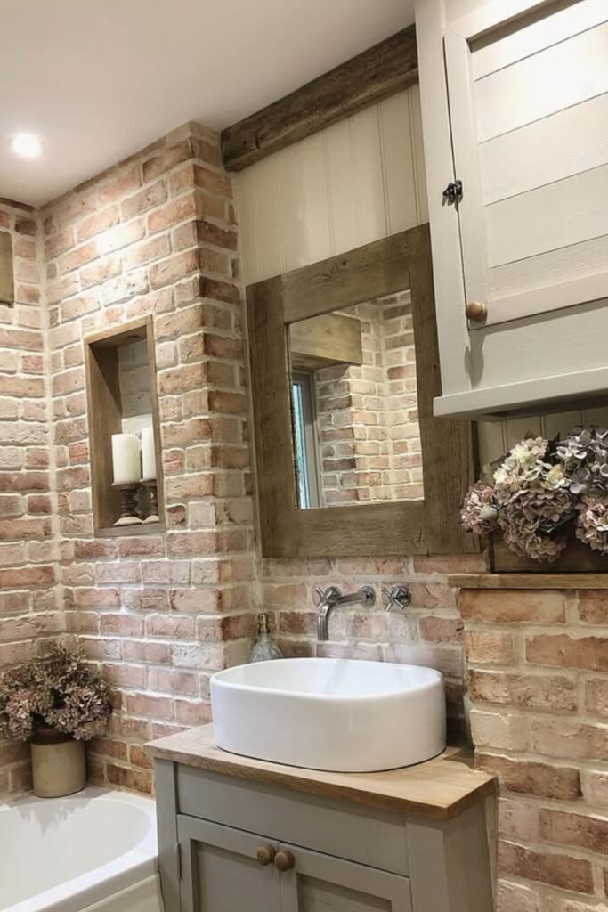 You can bring rustic warmth to your bathroom with exposed brick walls and weathered wood touches.