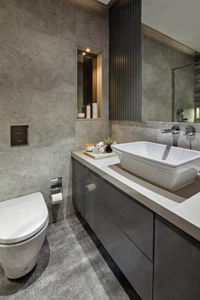 You can give your bathroom that modern, polished edge with matte grey walls, a floating vanity, and a geometric vessel sink that instantly catches the eye.