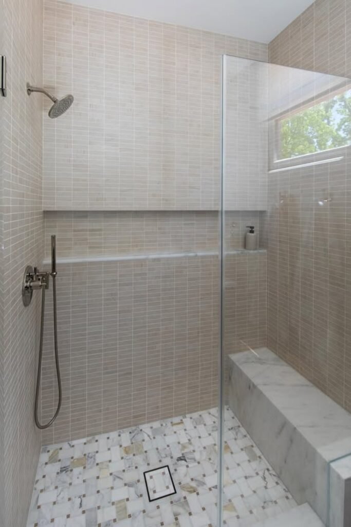 The mosaic marble floor adds texture and quiet luxury, while the built-in bench and niche keep everything sleek and functional.
