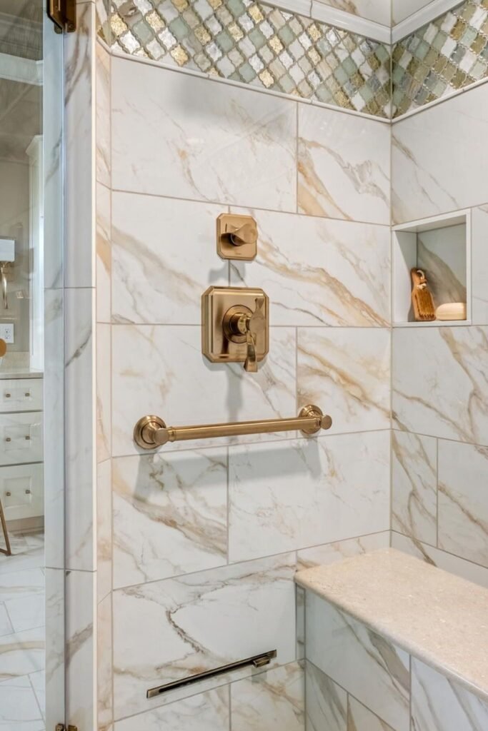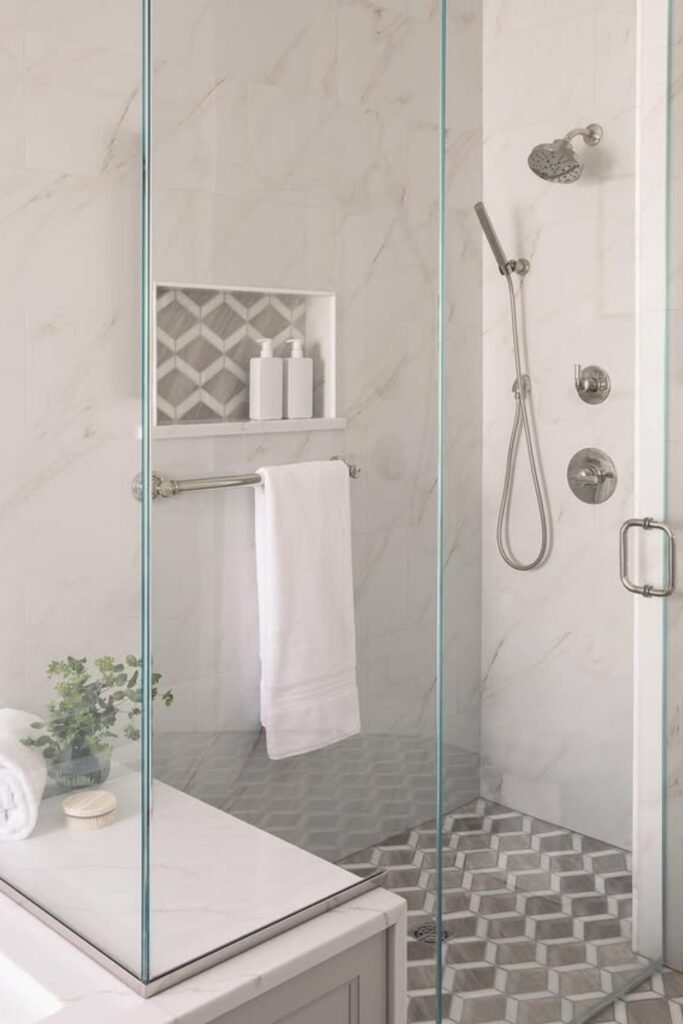 You’ll want soft veined marble tiles on the walls, bold patterned flooring for contrast, and a matching accent detail in a small niche or border.