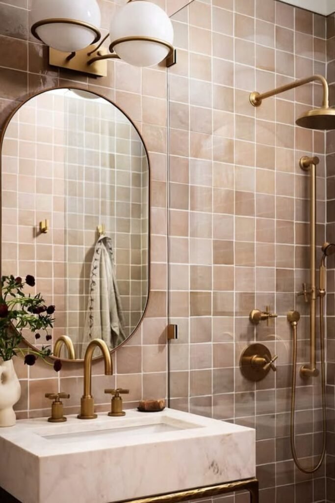 To bring it to life, choose matte rose square tiles, gold-toned lighting, and a hint of marble to keep it polished and charming.