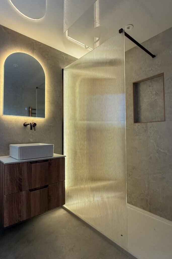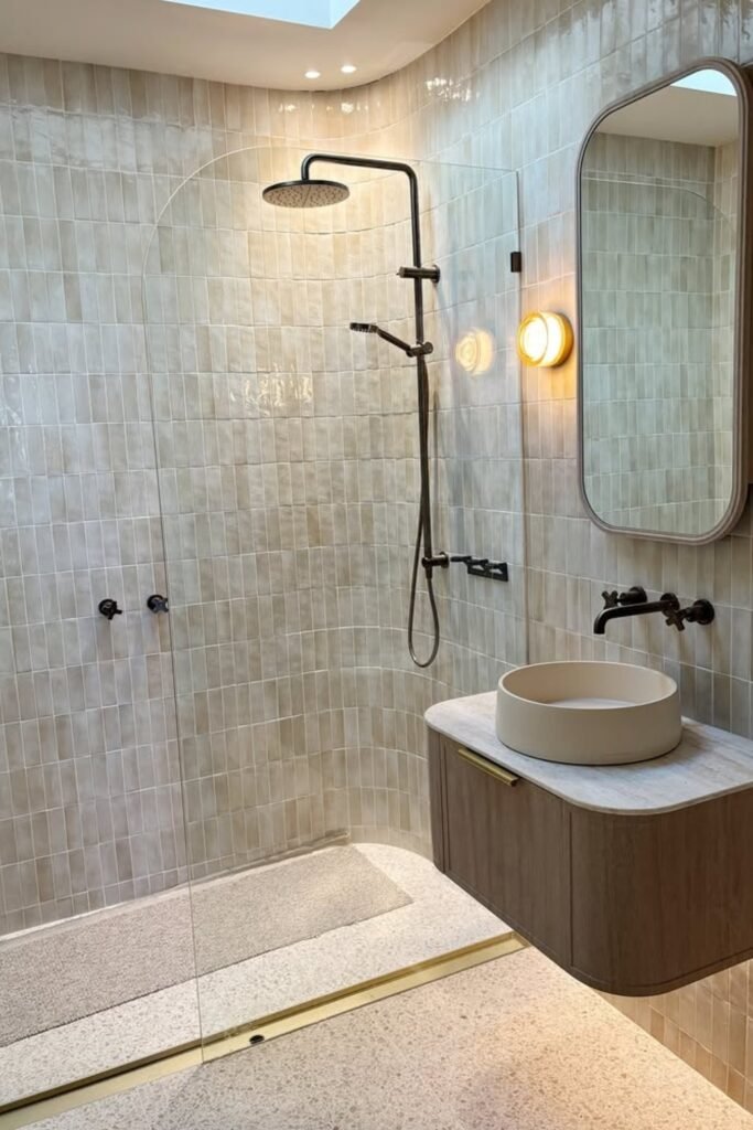 You can go for glossy vertical tiles, matte black fixtures, and a backlit curved mirror to bring that soft, spa-like glow you’ll never get tired of.