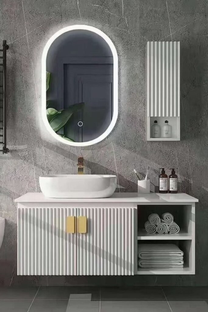 The white fluted cabinet with gold handles gives you that perfect mix of texture and elegance, while the backlit oval mirror adds a futuristic edge.