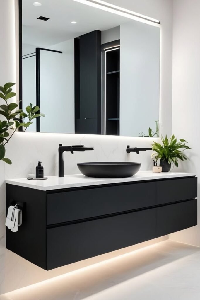 The floating design instantly adds a high-end, modern vibe, while the crisp white countertop and black vessel sink make every detail stand out.