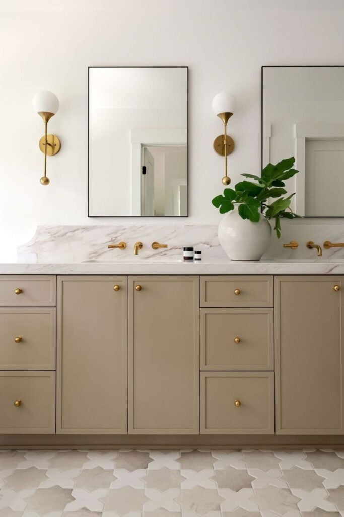 The taupe vanity with gold hardware adds subtle warmth, while the marble backsplash and geometric floor tiles keep things interesting.