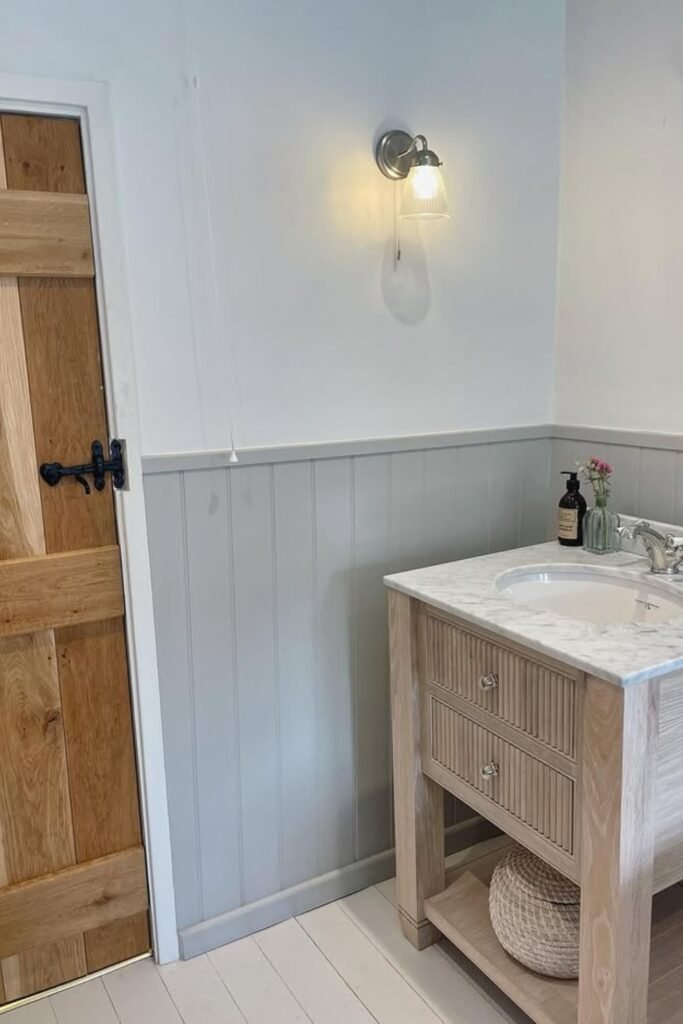 The lightwood vanity paired with a marble countertop feels clean and airy, while beadboard paneling and soft gray wainscoting add cozy detail.