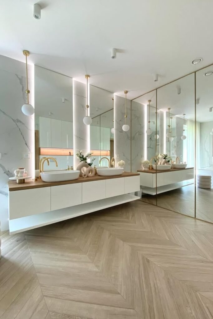 A floating double vanity with vessel sinks gives you symmetry and space, ideal for a master bathroom.