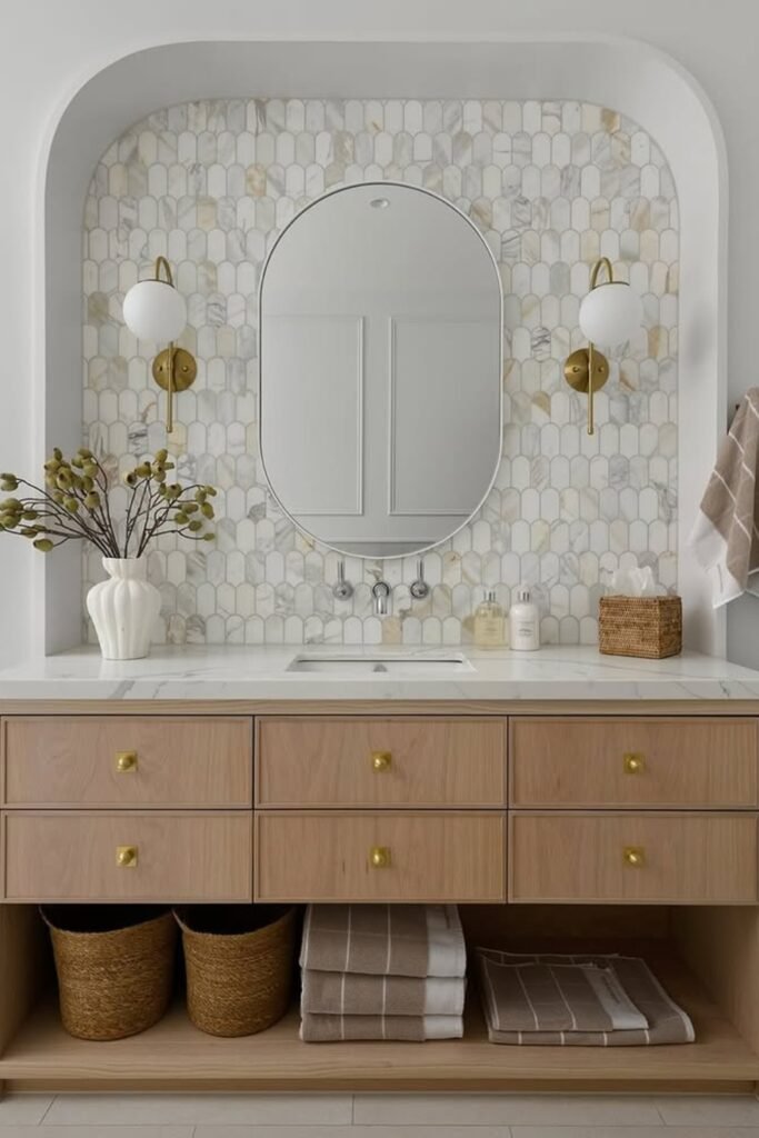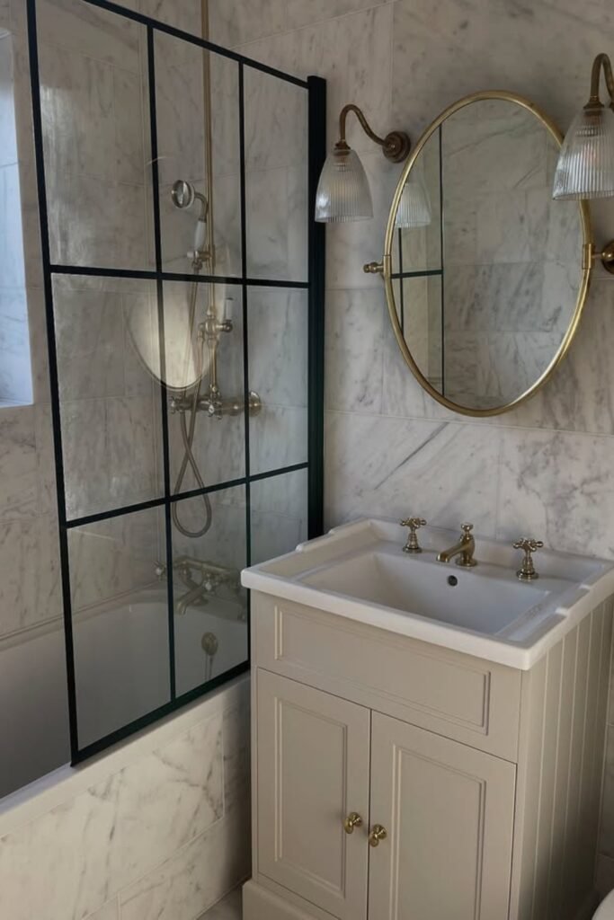 When you add an arched gold mirror and brass fixtures, you bring in that warm, vintage elegance that suits traditional or romantic spaces.