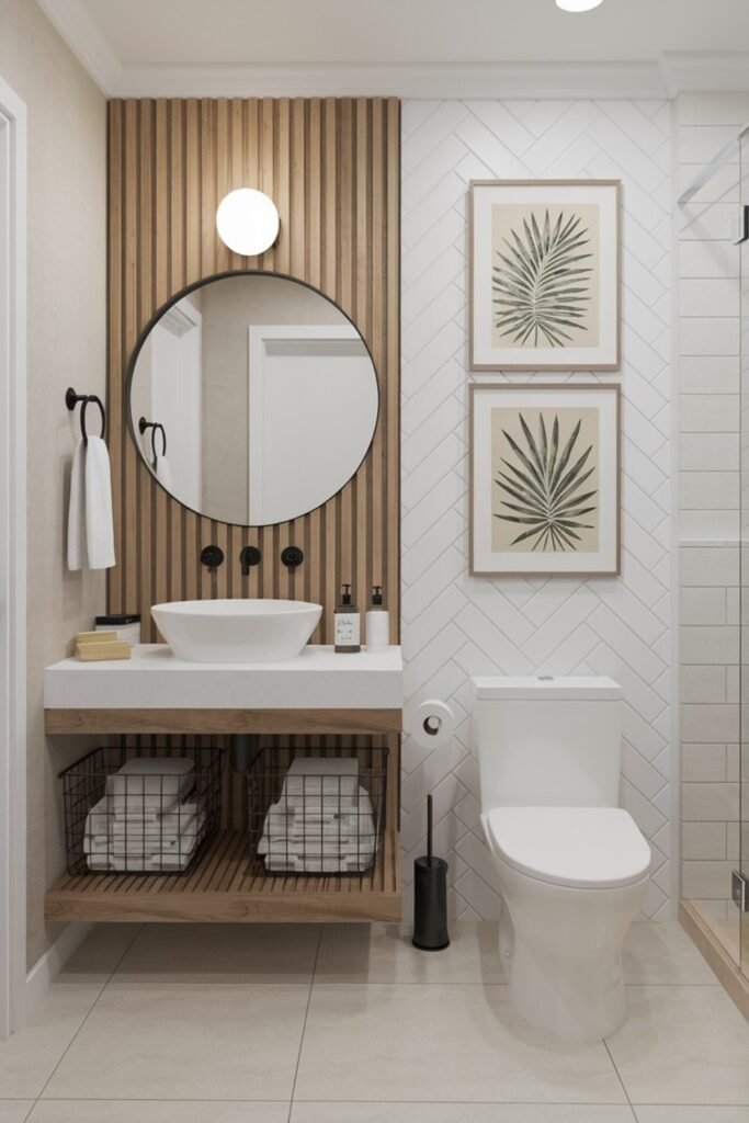 It is perfect for small bathrooms, this design gives you openness, contrast, and peace, all built on simple, natural materials.