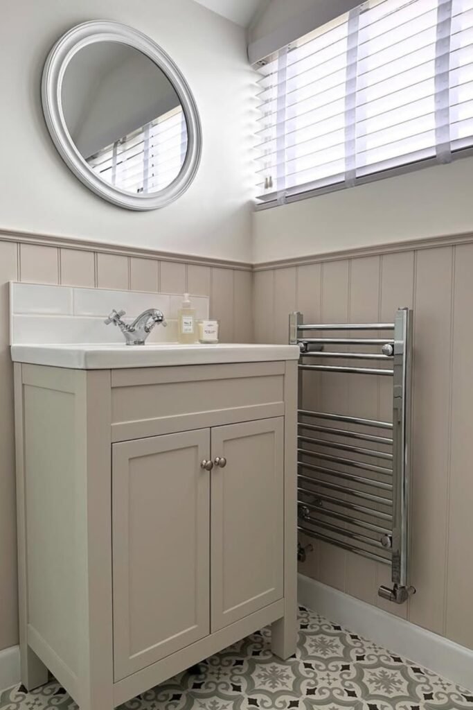 The cream vanity with shaker doors fits perfectly under the window, and the panelled walls with patterned tiles add subtle character.