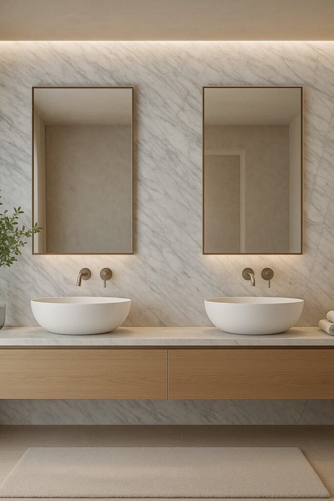 You can create a bathroom that feels both calm and luxurious by blending warm wood with cool marble.