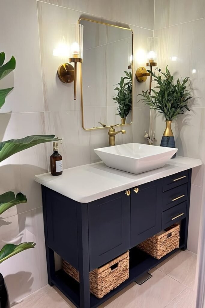Your navy vanity with brass handles pairs beautifully with a gold-framed mirror and wall sconces, wrapping the space in a warm, luxurious glow.