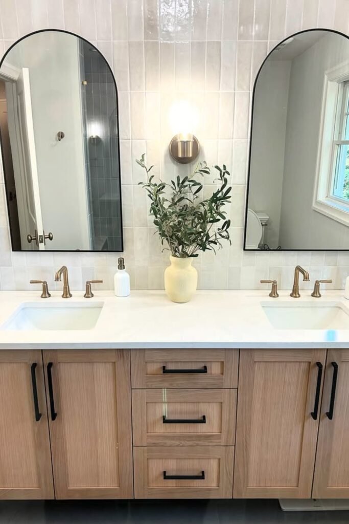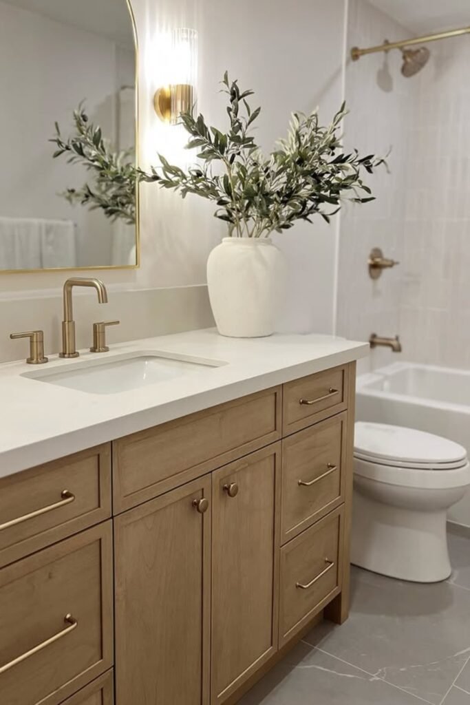 You have to choose soft beige tiles, mix black and gold hardware, and place a neutral vase of greenery for a fresh, spa-like finish.