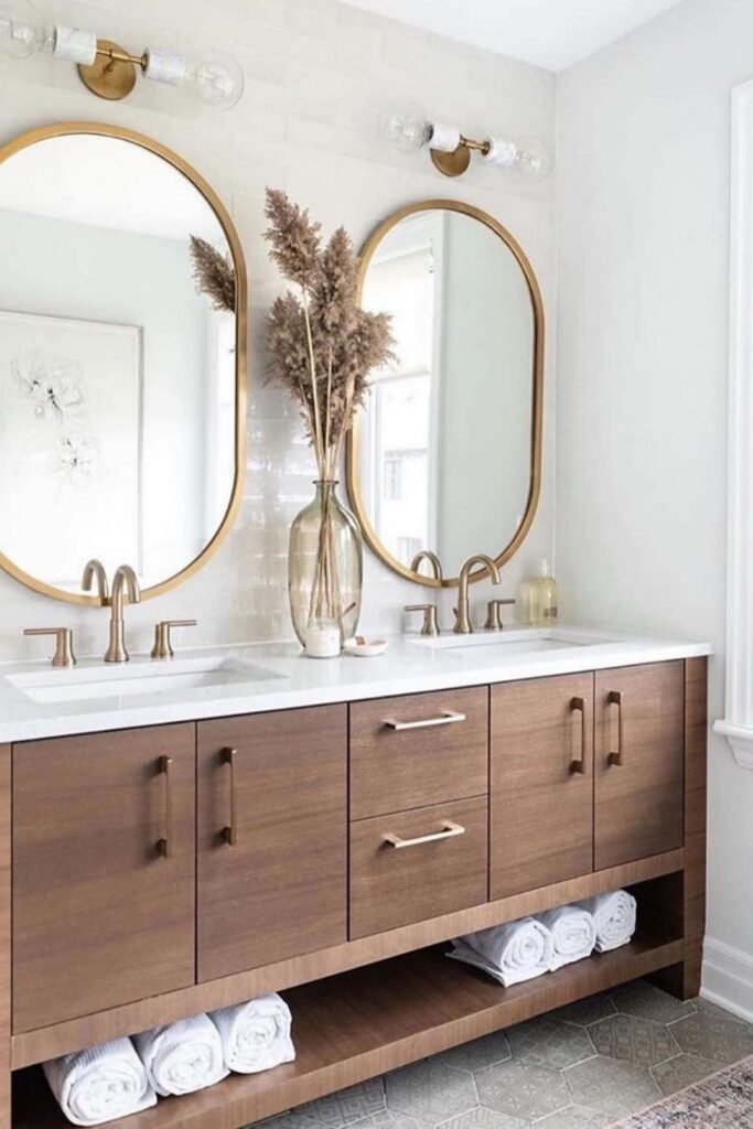 A tall oval mirror elongates the wall, instantly making your space feel larger, perfect if you’re working with a narrow powder room or ensuite.