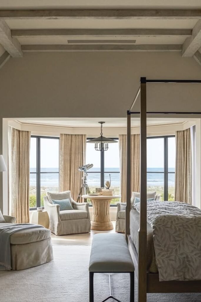 You can choose neutral upholstery so you keep the focus on light and views, and you might add a small center table so you can read or wind down without creating a second living room.