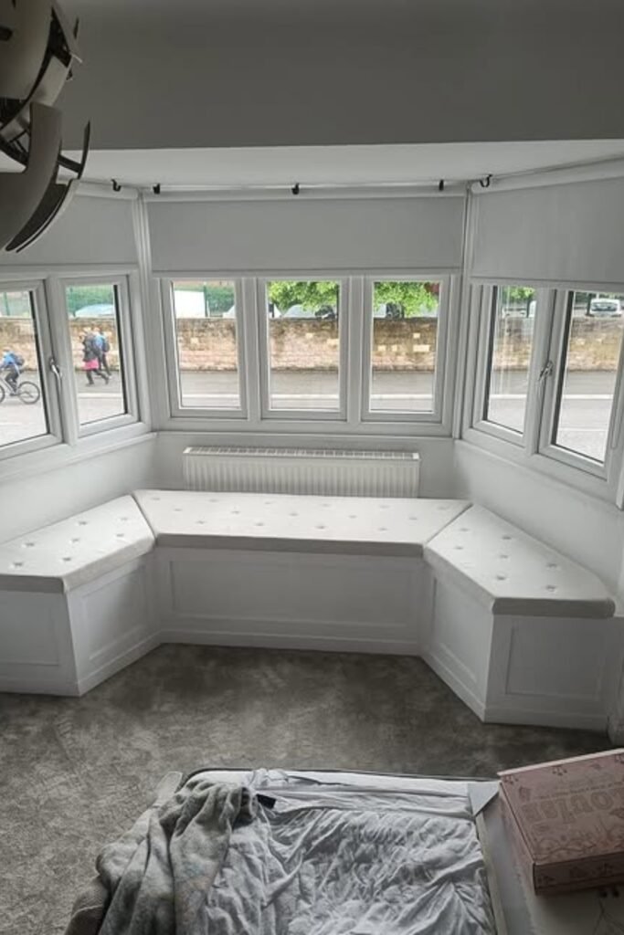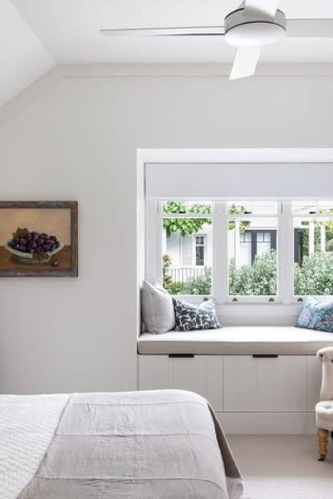 You should keep the cushions simple and you can choose a clean blind so you help the bay blend into the wall instead of stealing attention from the bed.