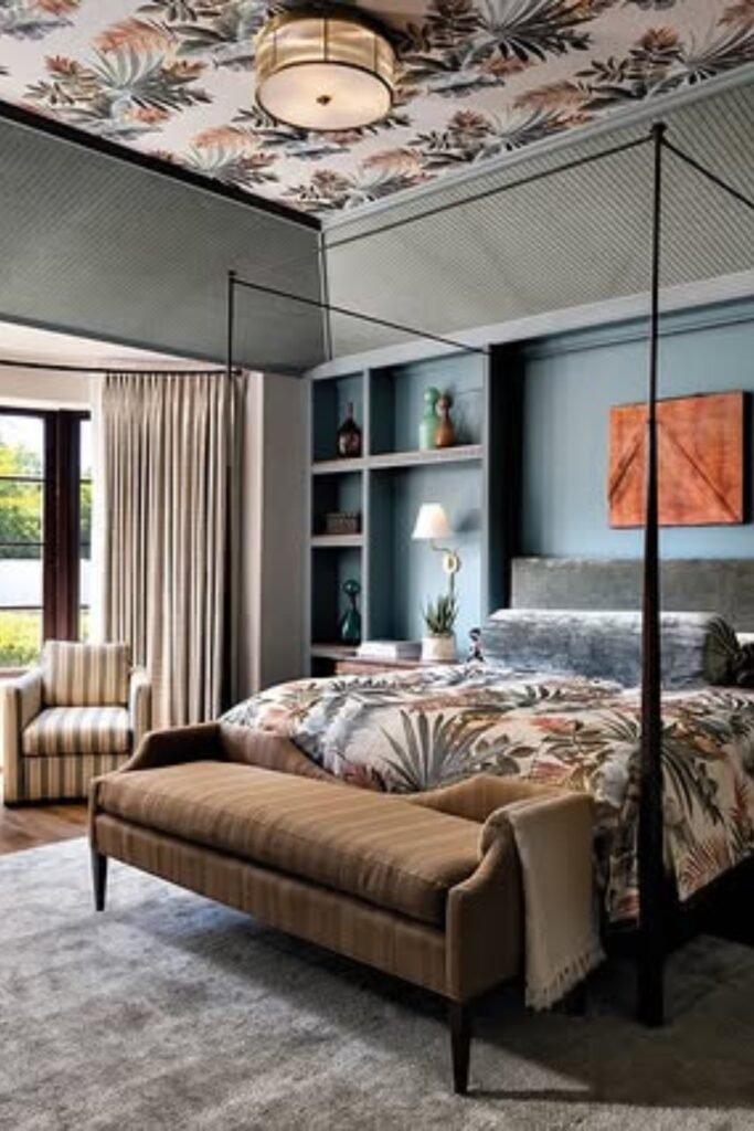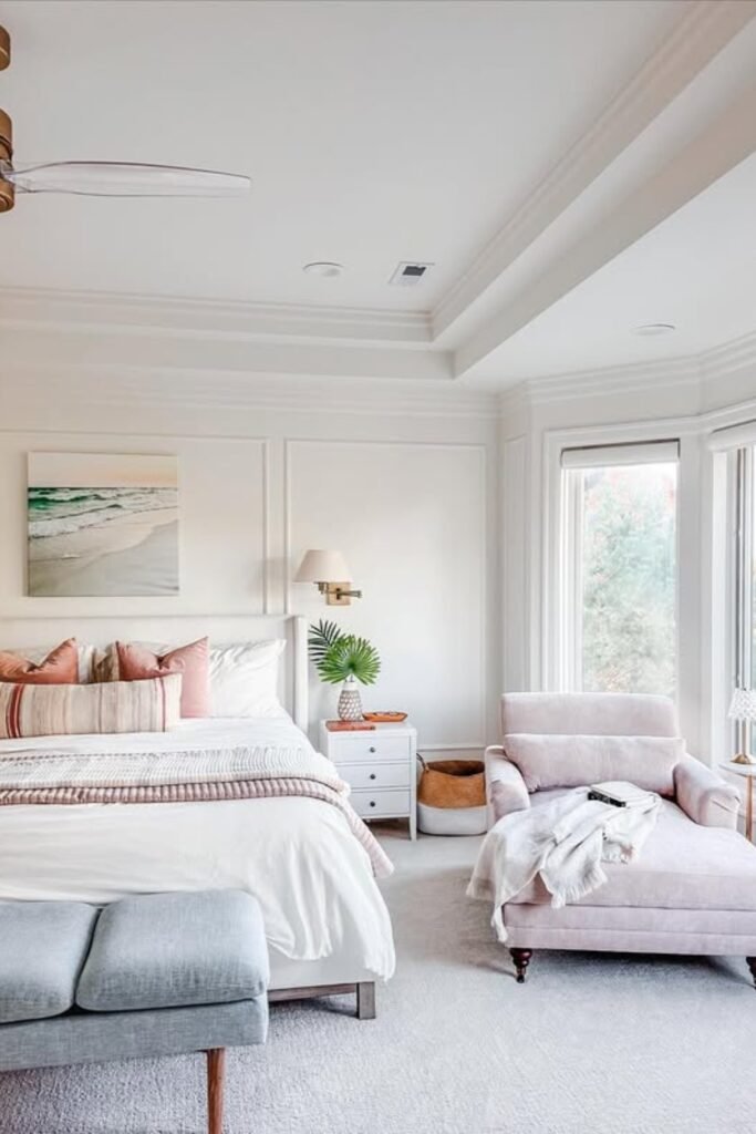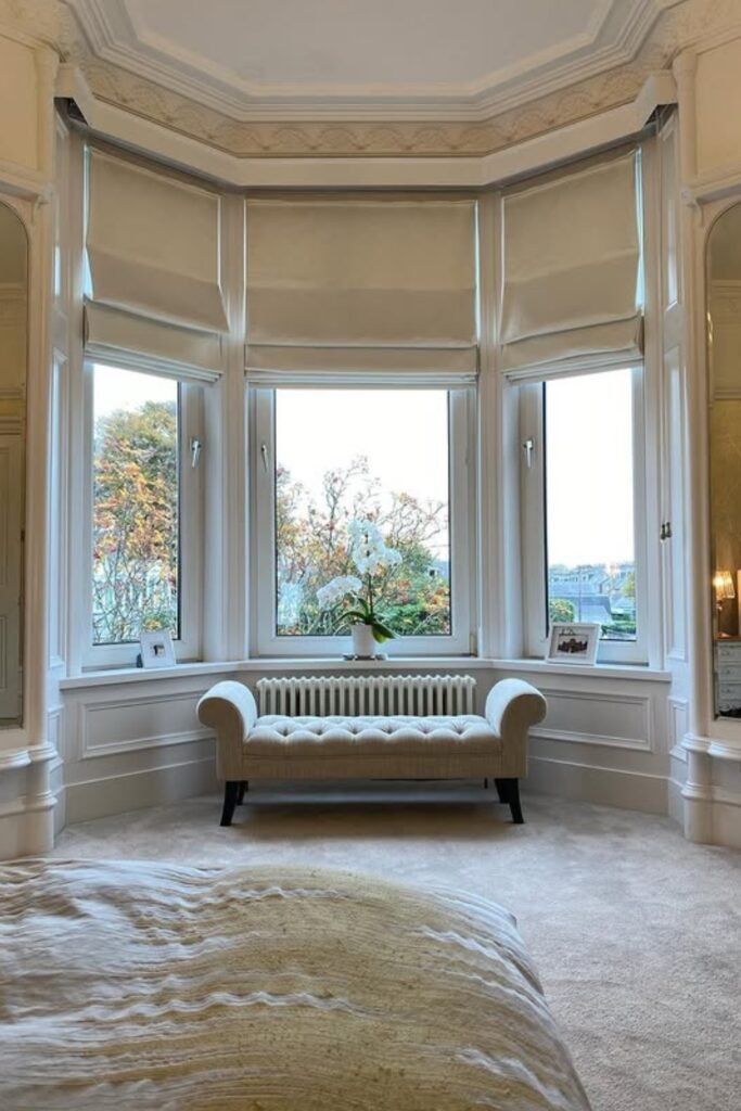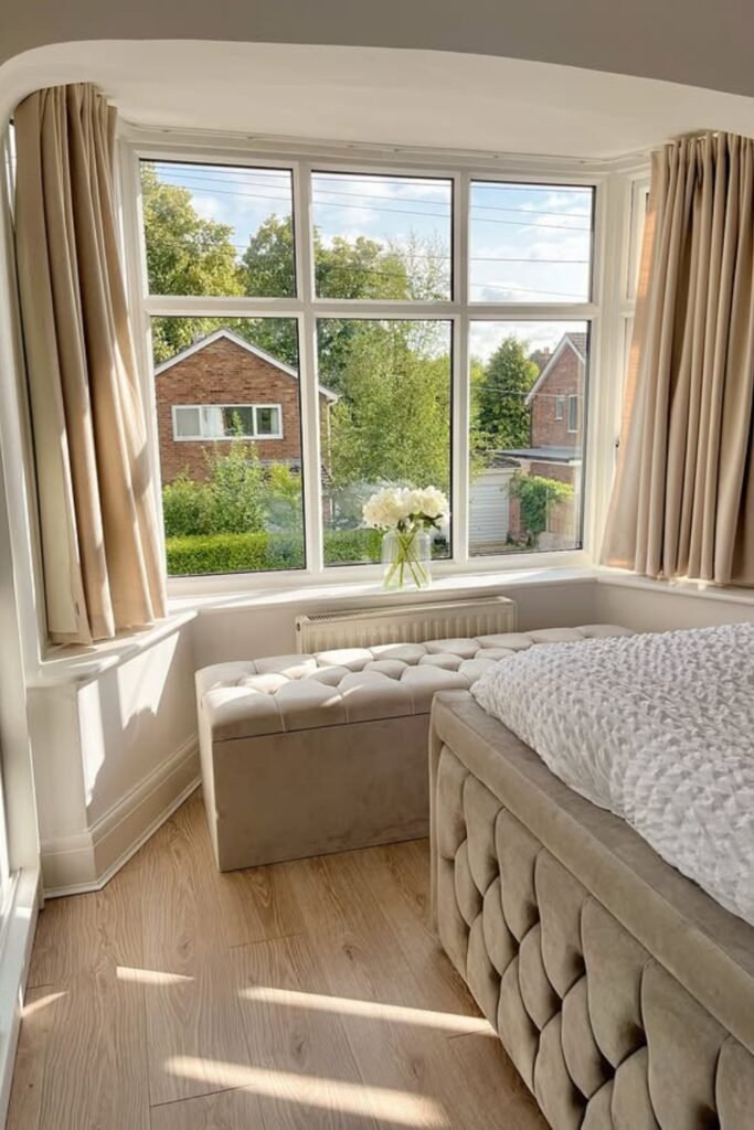 If your bedroom has high ceilings or classic details, you can let the bay window act as a quiet focal point.