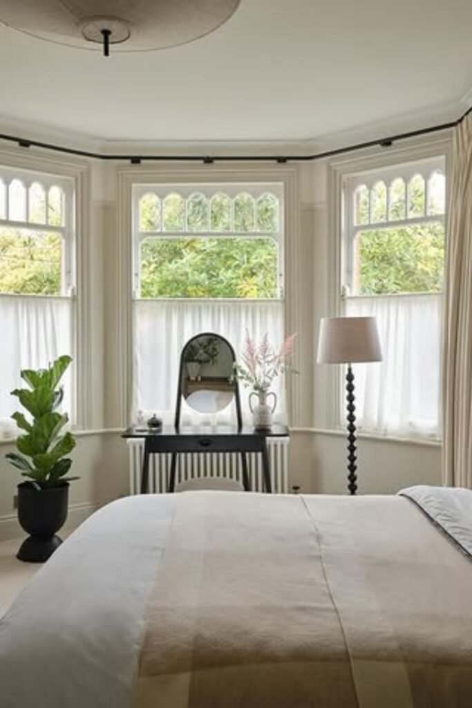 If you like waking up with natural light but you still want your bedroom to feel gentle, you can use this bay window setup.