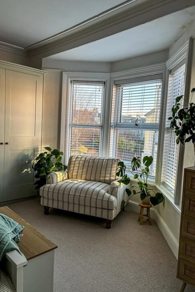 If you want your bedroom to feel slow, quiet, and intentional, you can let the bay window stay open and lightly furnished.