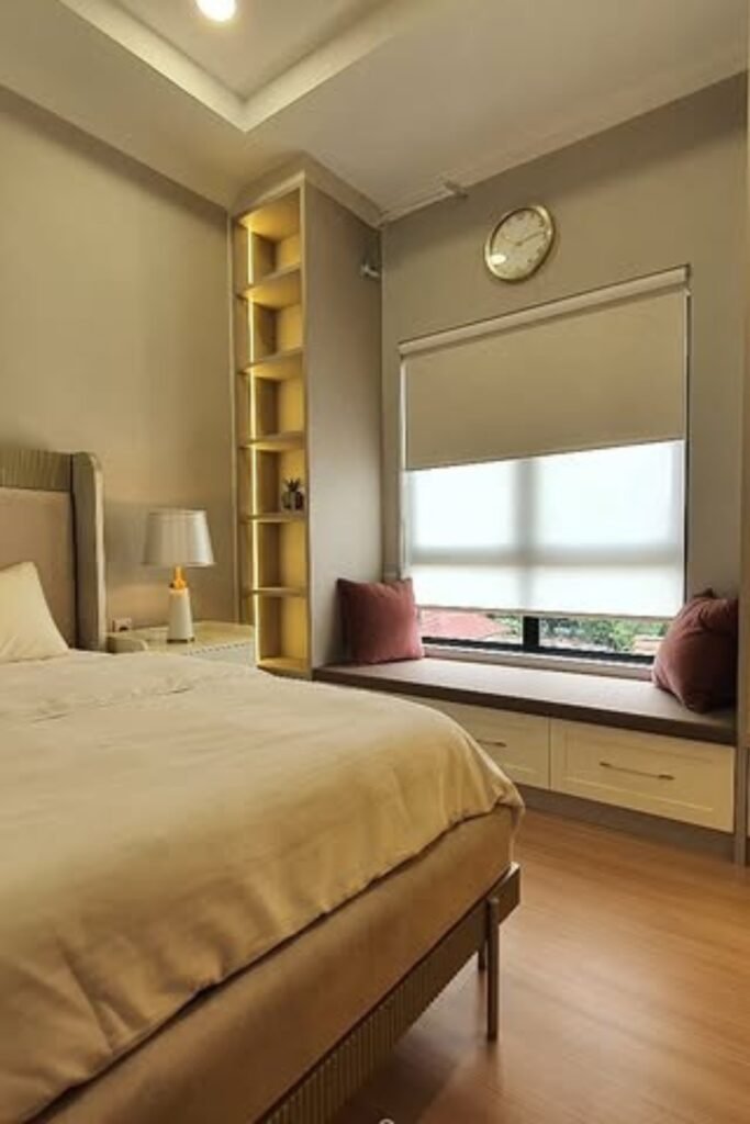 If your bedroom feels short on storage but you don’t want bulky furniture, you can use the bay window to solve both problems at once.