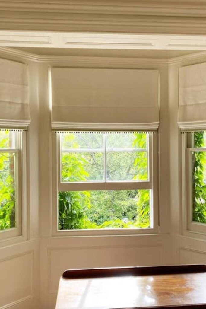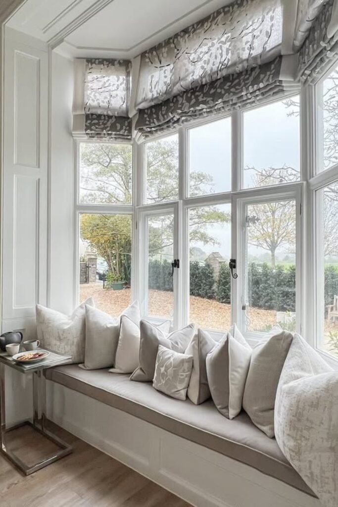 You should use Roman shades so you control light while preserving the window shape. When you keep décor minimal, you allow the bay to feel refined, intentional, and restful.