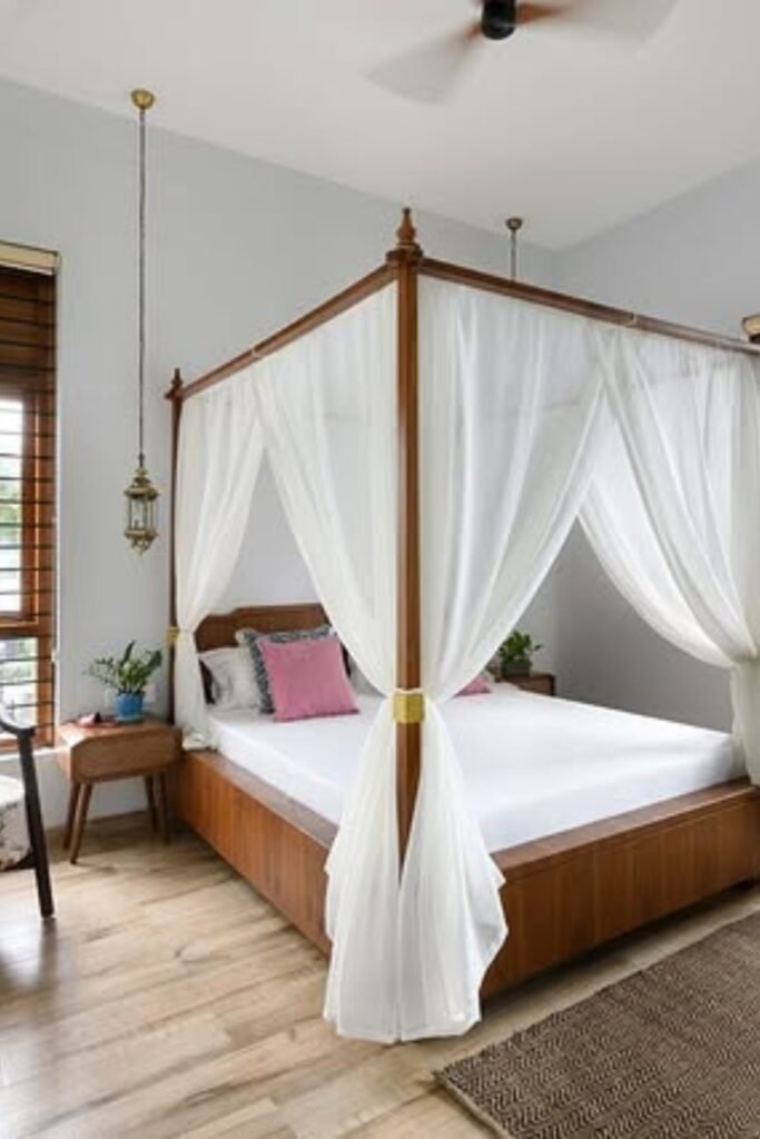 This works best when you have a calm, neutral bedroom and you keep the bed close to the window.