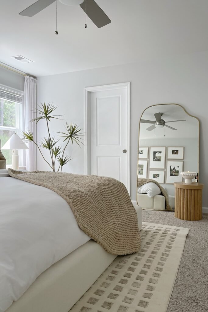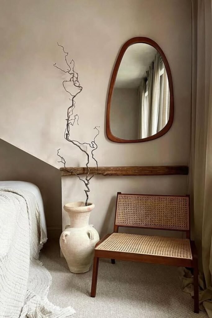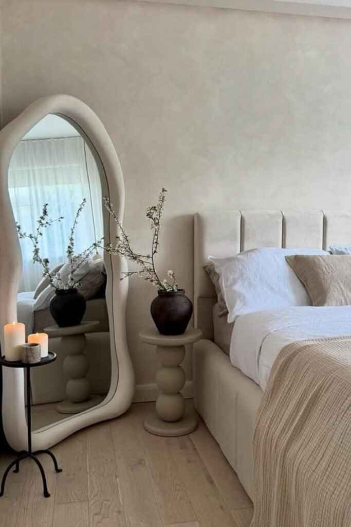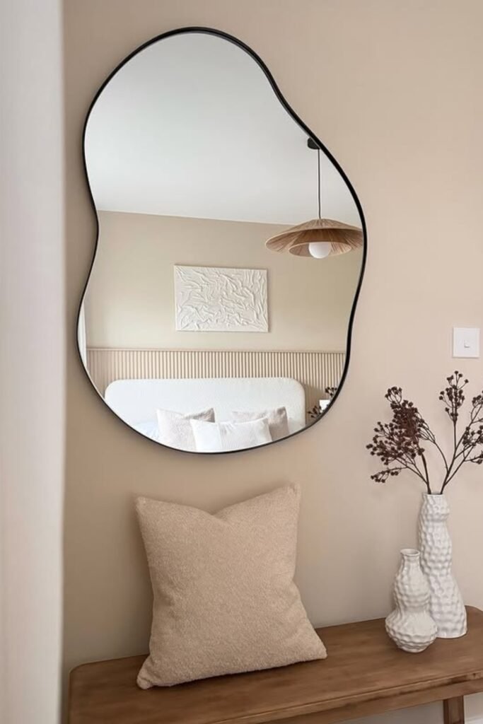 When you place an irregular-shaped mirror in a calm, neutral bedroom, you can make it feel less plain or boxy.