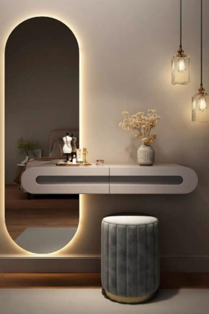 You can turn a simple bedroom mirror into a mood setter with soft lighting. The glow adds depth, makes evenings calmer, and doubles as accent lighting.