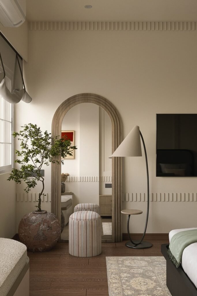 You can make a tall arched mirror anchor an entire bedroom when the layout feels open but slightly unfinished.