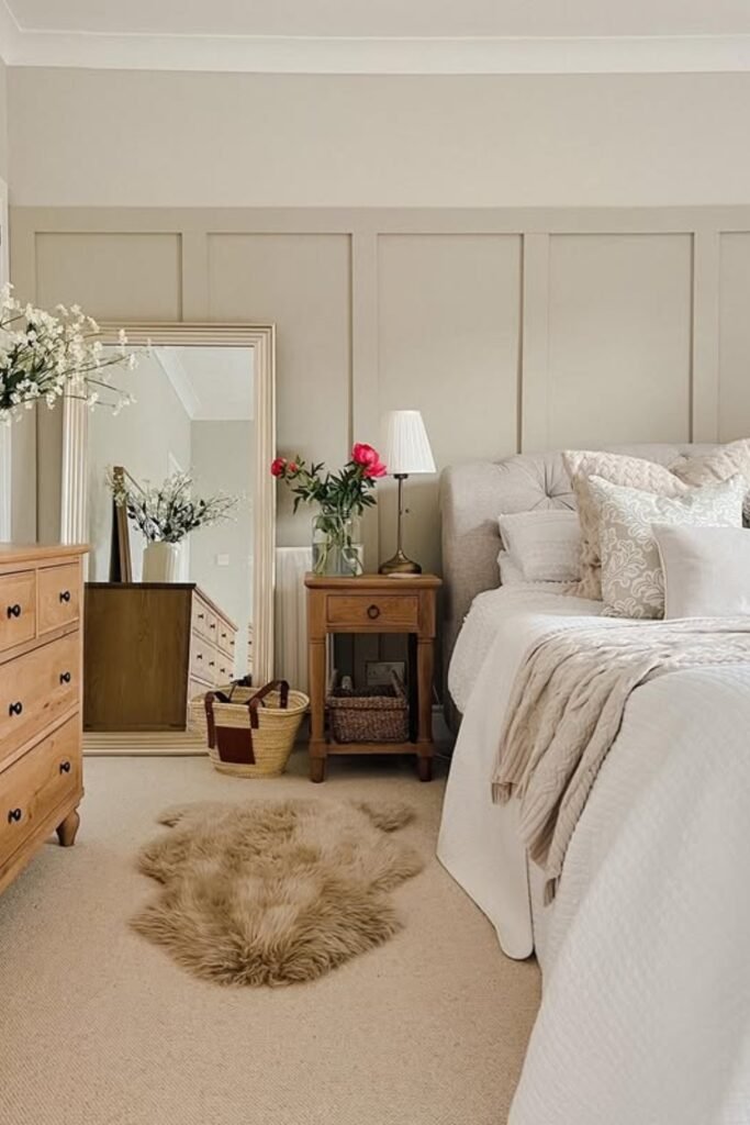 You can pair light wood tones, textured rugs, and simple bedside decor so the mirror blends in without disappearing.
