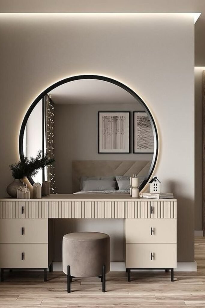 You will discover that a round mirror with built-in lighting can turn your bedroom vanity into a full feature wall.