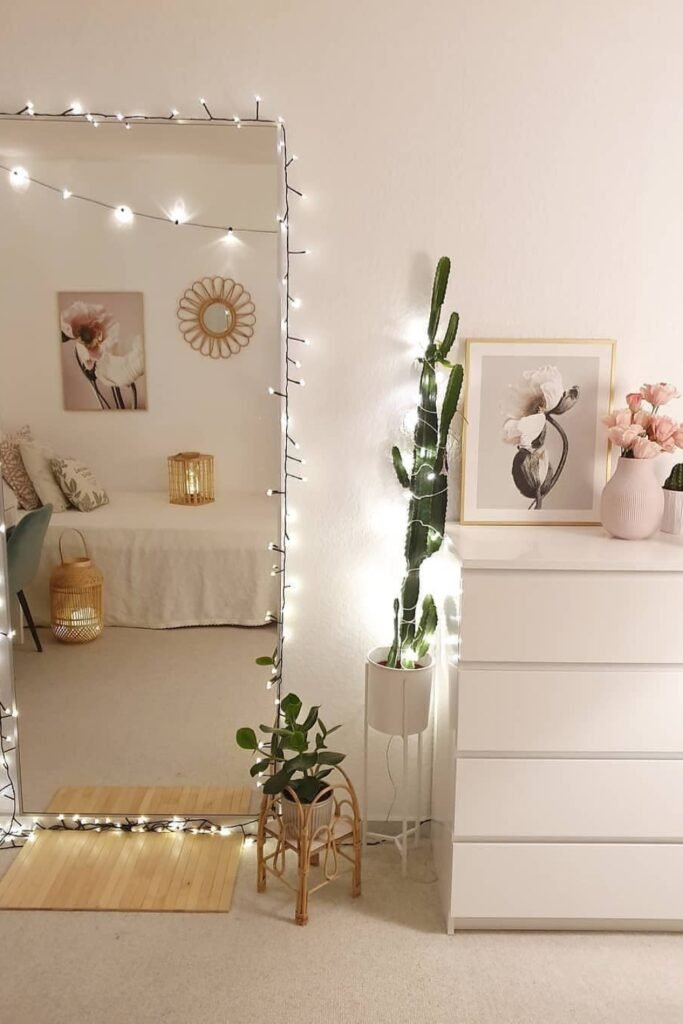 When you wrap fairy lights around a full-length mirror, you will notice it works best in cozy bedrooms where overhead lighting feels harsh.