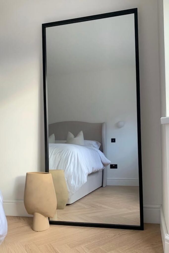 If you lean a tall black-framed mirror against the wall, you can make the space feel calm but slightly more finished.