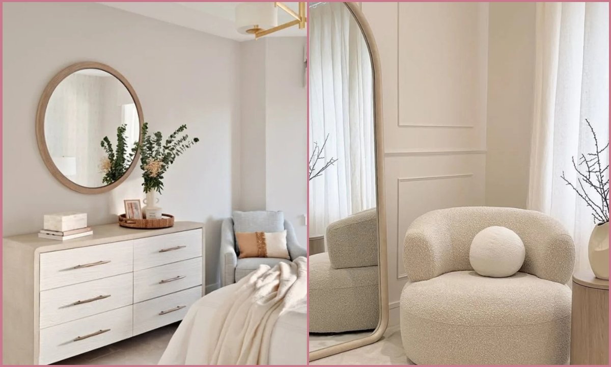 You can recreate this by pairing rounded furniture with light fabrics and keeping the mirror slightly angled so you reflect openness, not walls.