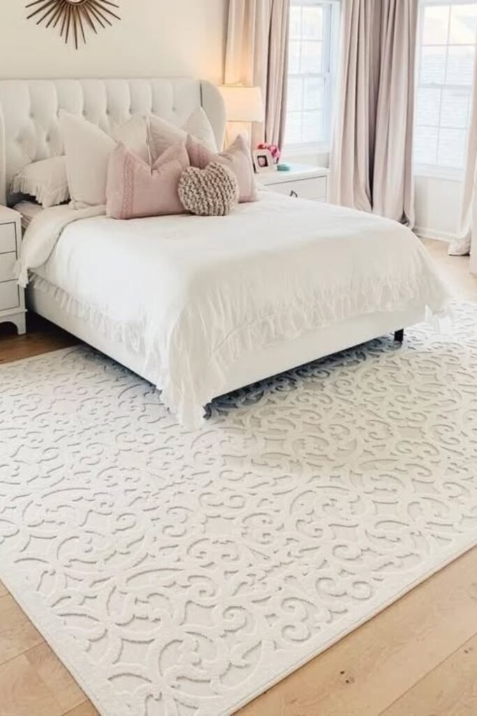 A sculpted white rug like this adds definition without breaking your soft palette. The raised pattern gives you texture you can actually feel, which keeps the space from looking flat or sterile.