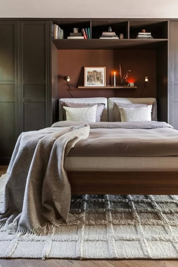 This setup works best when you’re styling a modern or custom bedroom and you need a warm, calming counterbalance to dark wood.