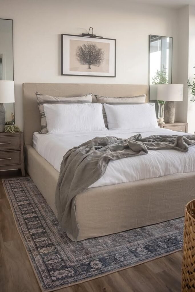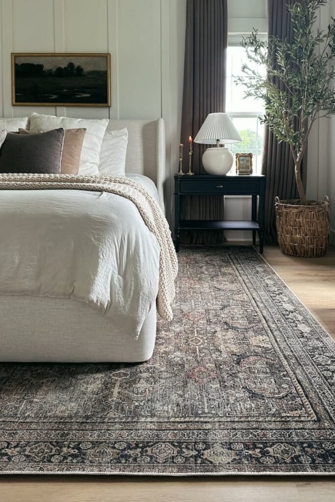 That’s where you want the rug to slow everything down for you. A soft neutral rug like this adds weight under your bed, so you feel the room settle instead of drift.