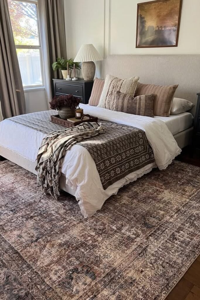 A darker, softly distressed rug like this gives your space that missing weight, so your bed feels settled instead of floating.